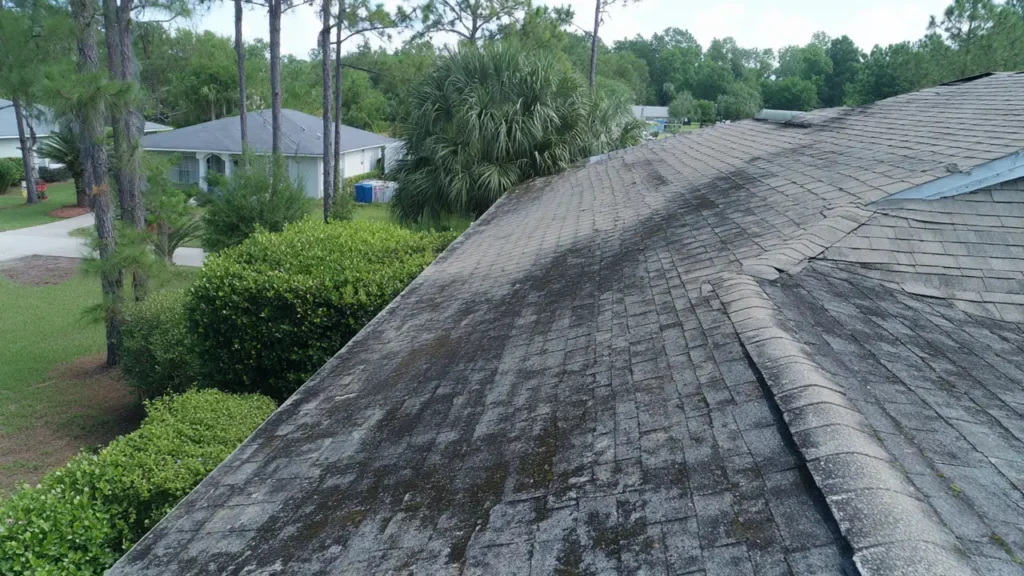 Roof algae, or Gloeocapsa magma, typically appears as dark, unattractive black streaks or stains on your roof. In Florida’s humid climate, this organic growth can also look like green or dark patches, especially in shaded areas that remain damp.